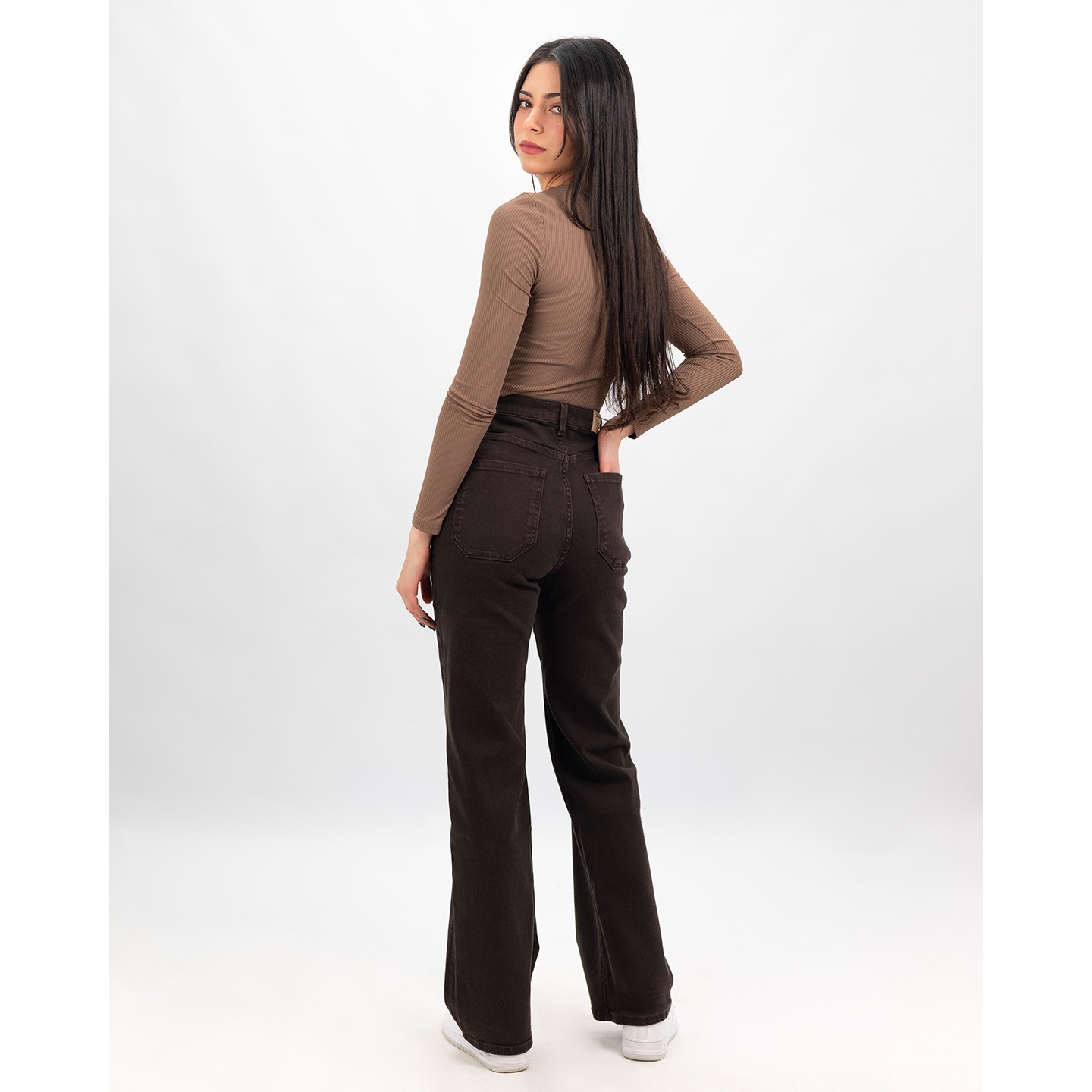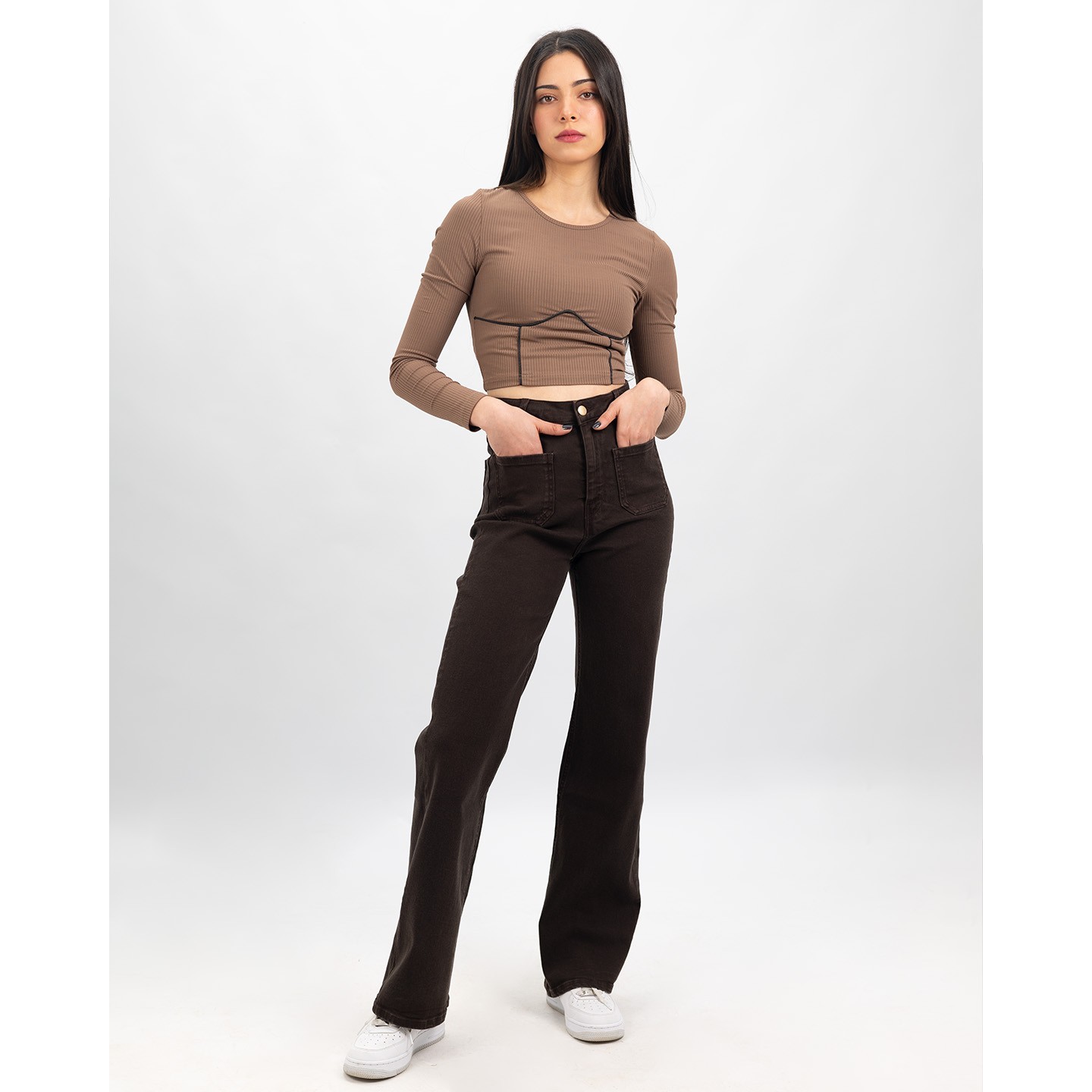 Jean coupe droite avec taille super haute qui met en valeur la silhouette. Les poches plaquées à l’avant apportent une touche originale et moderne.